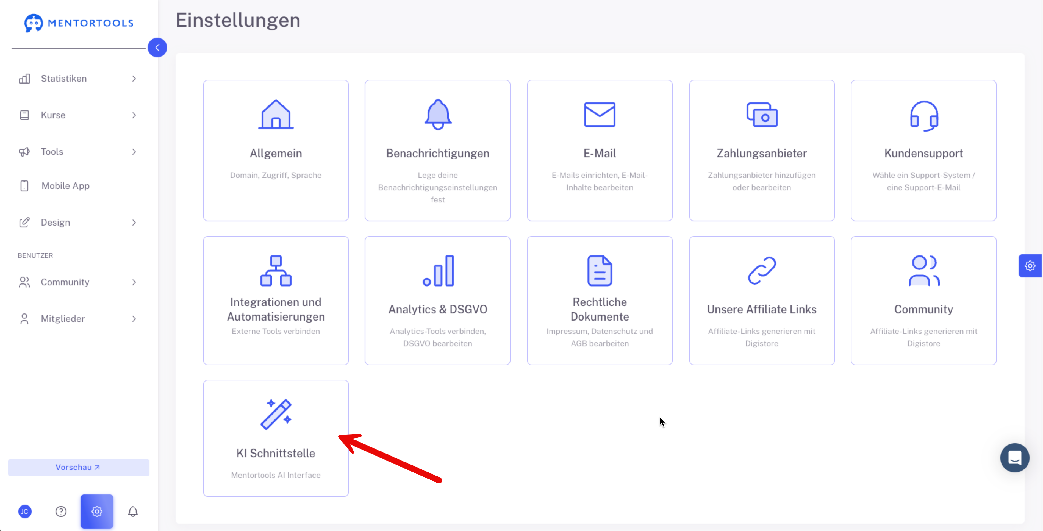 Logge dich in deinen Mentortools Account ein und klicke links unten auf “Einstellungen”. Danach gehe auf “KI Schnittstelle”.