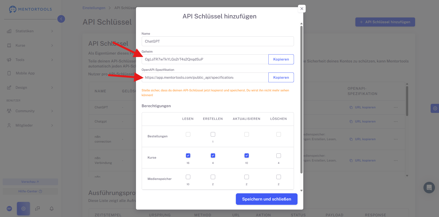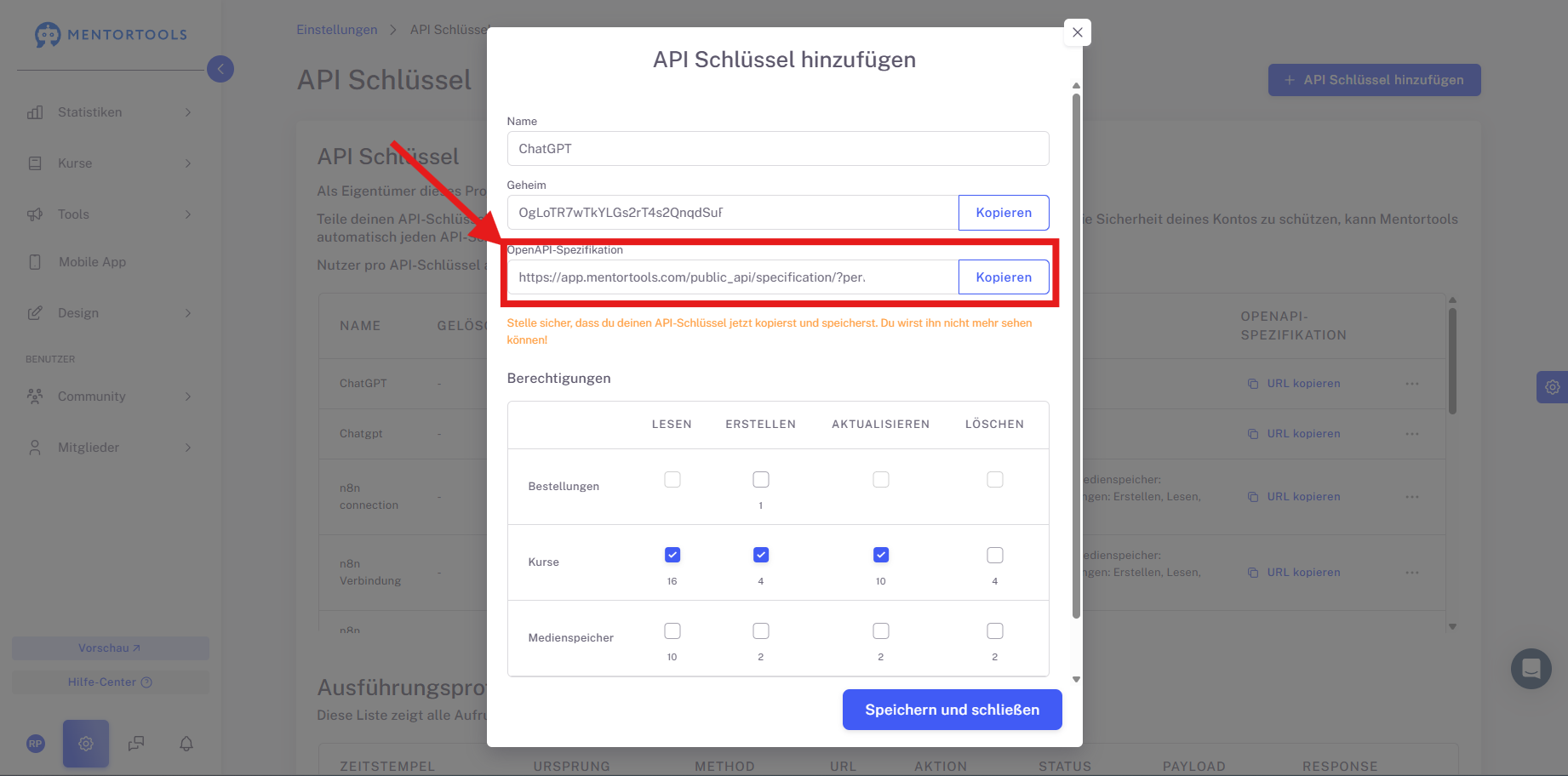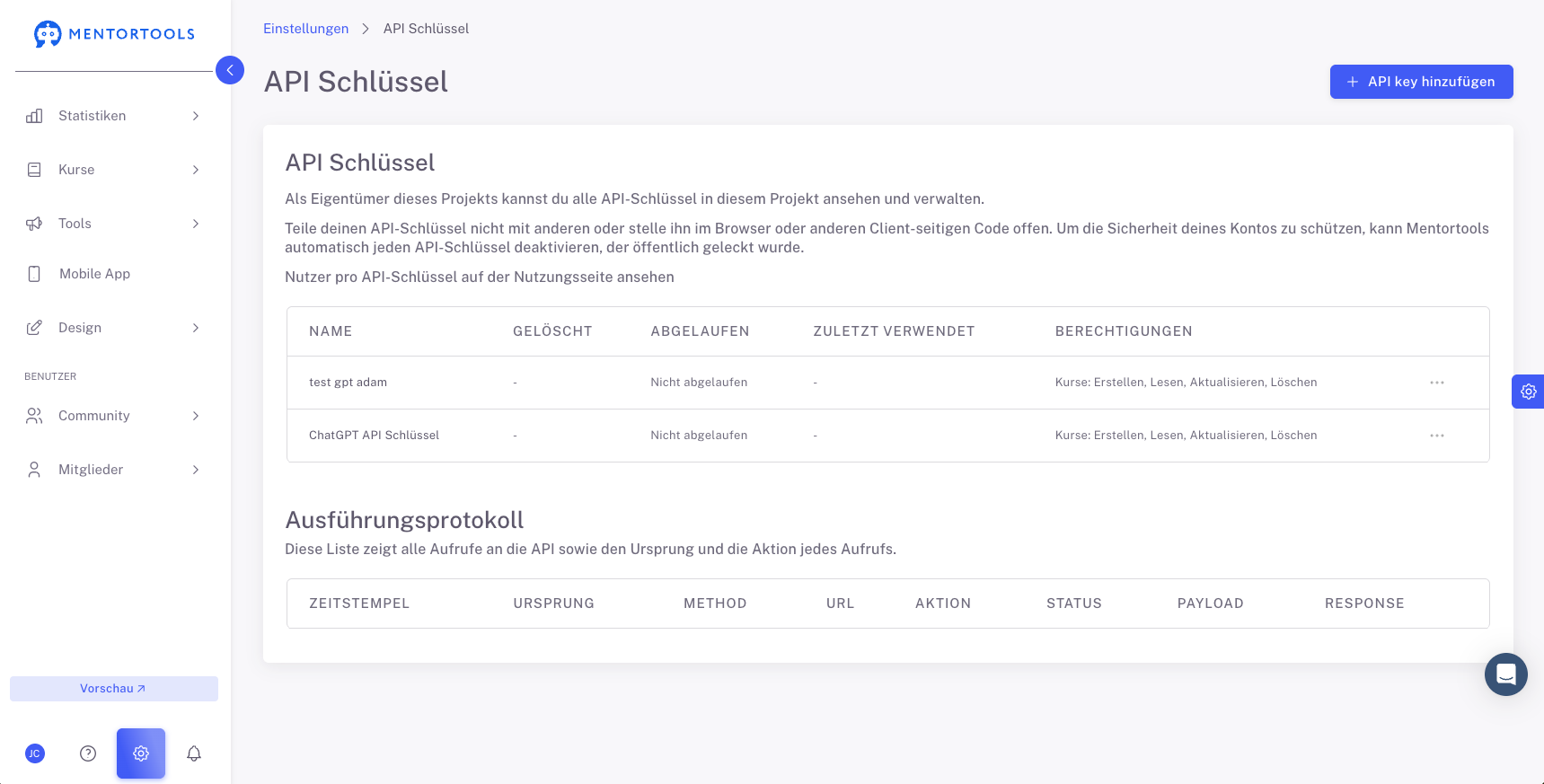 Hier findest du sogenannte API Schlüssel. Diese kannst du verwenden um deinen Mentortools Account mit externen Tools zu verknüpfen, auch mit ChatGPT.