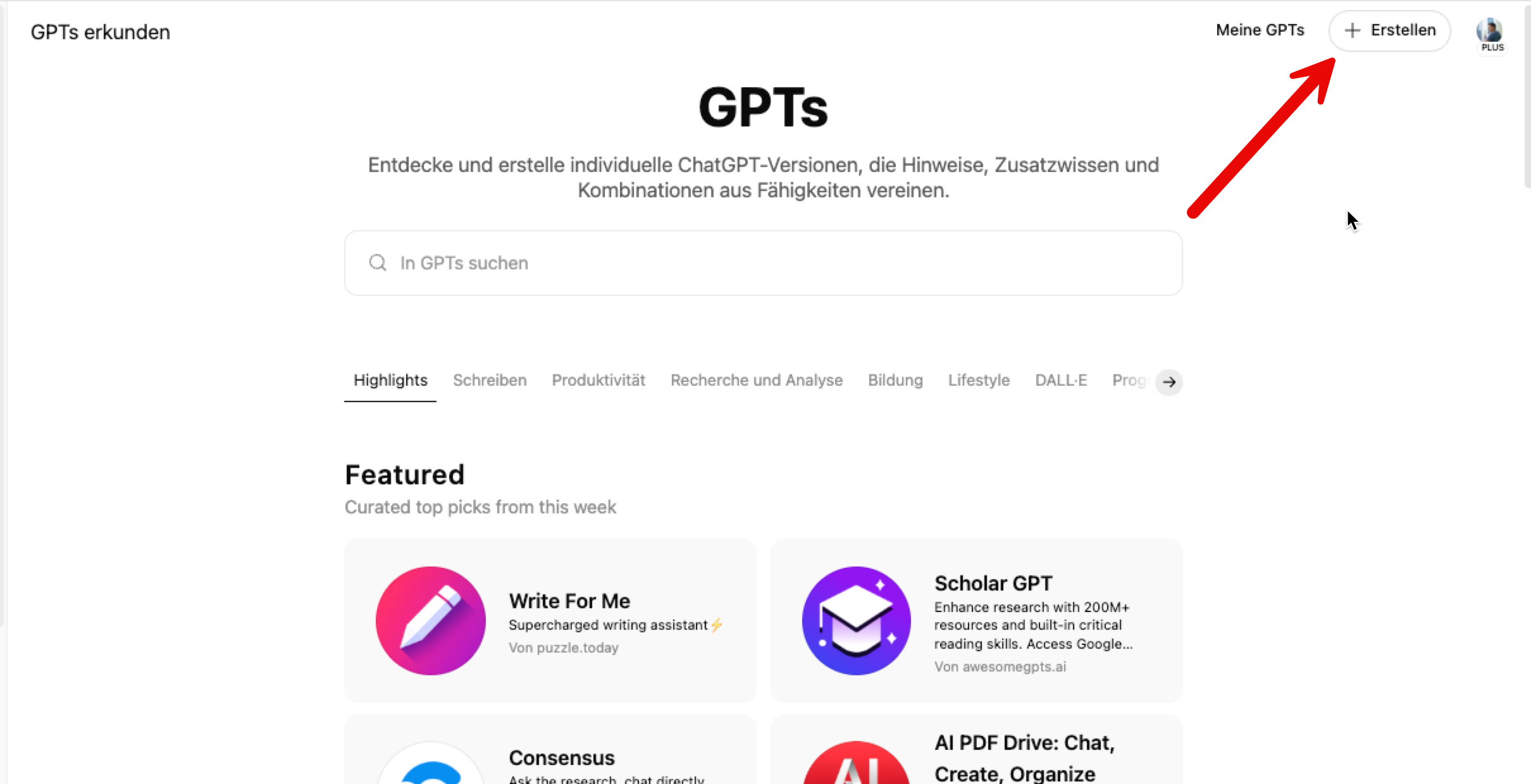Die Ansicht sieht dann so aus und du kannst rechts oben einen eigenen Custom GPT erstellen: