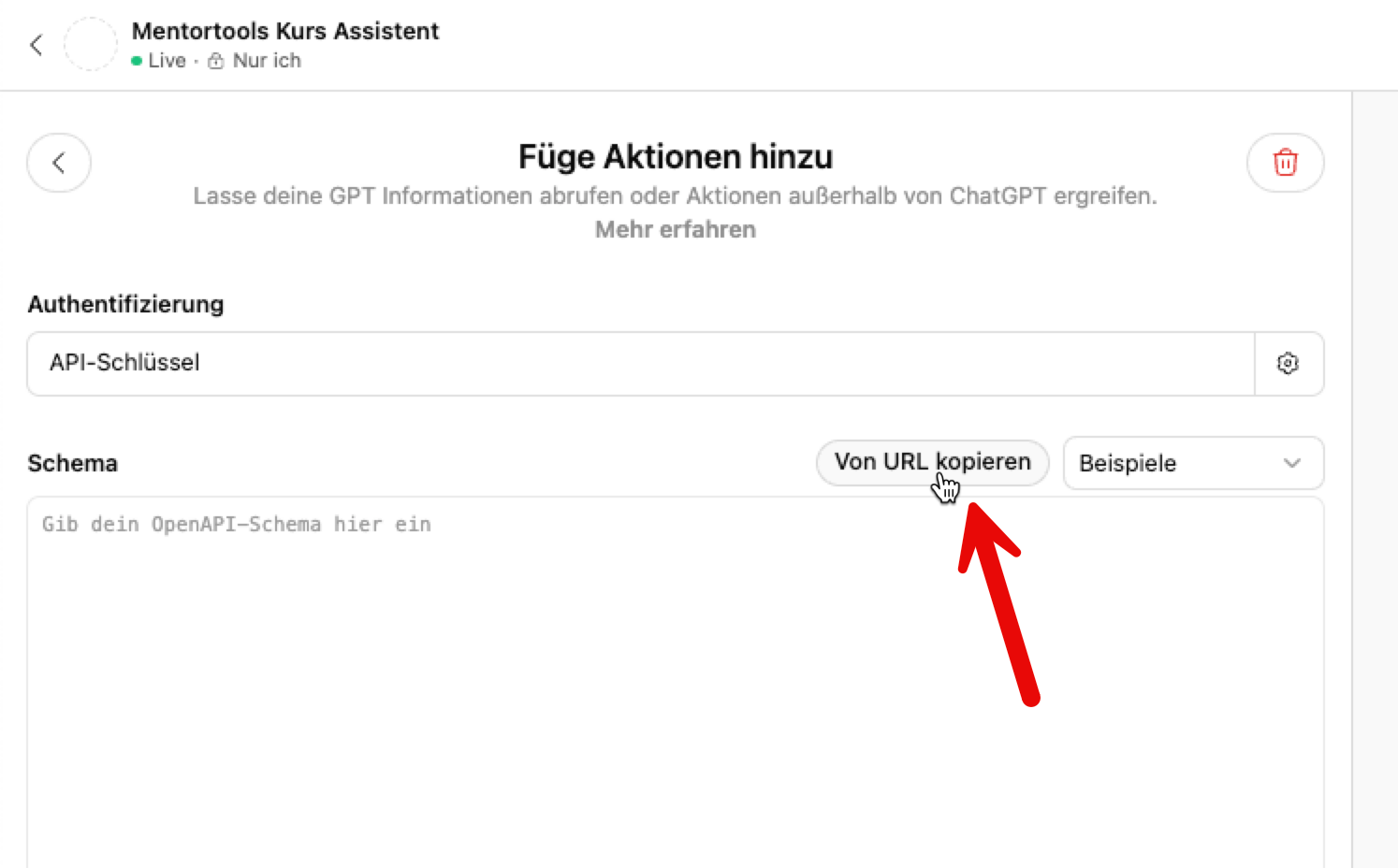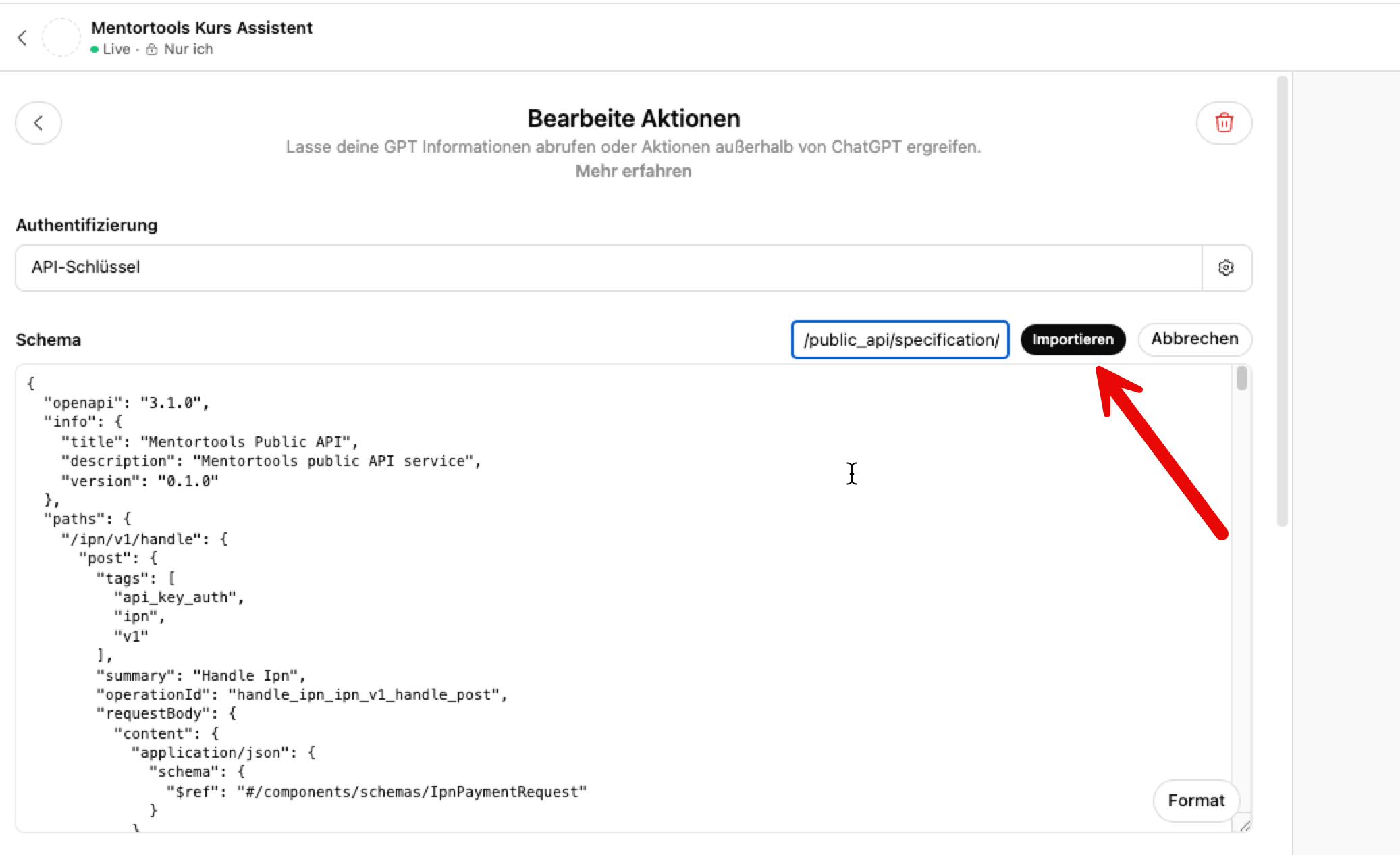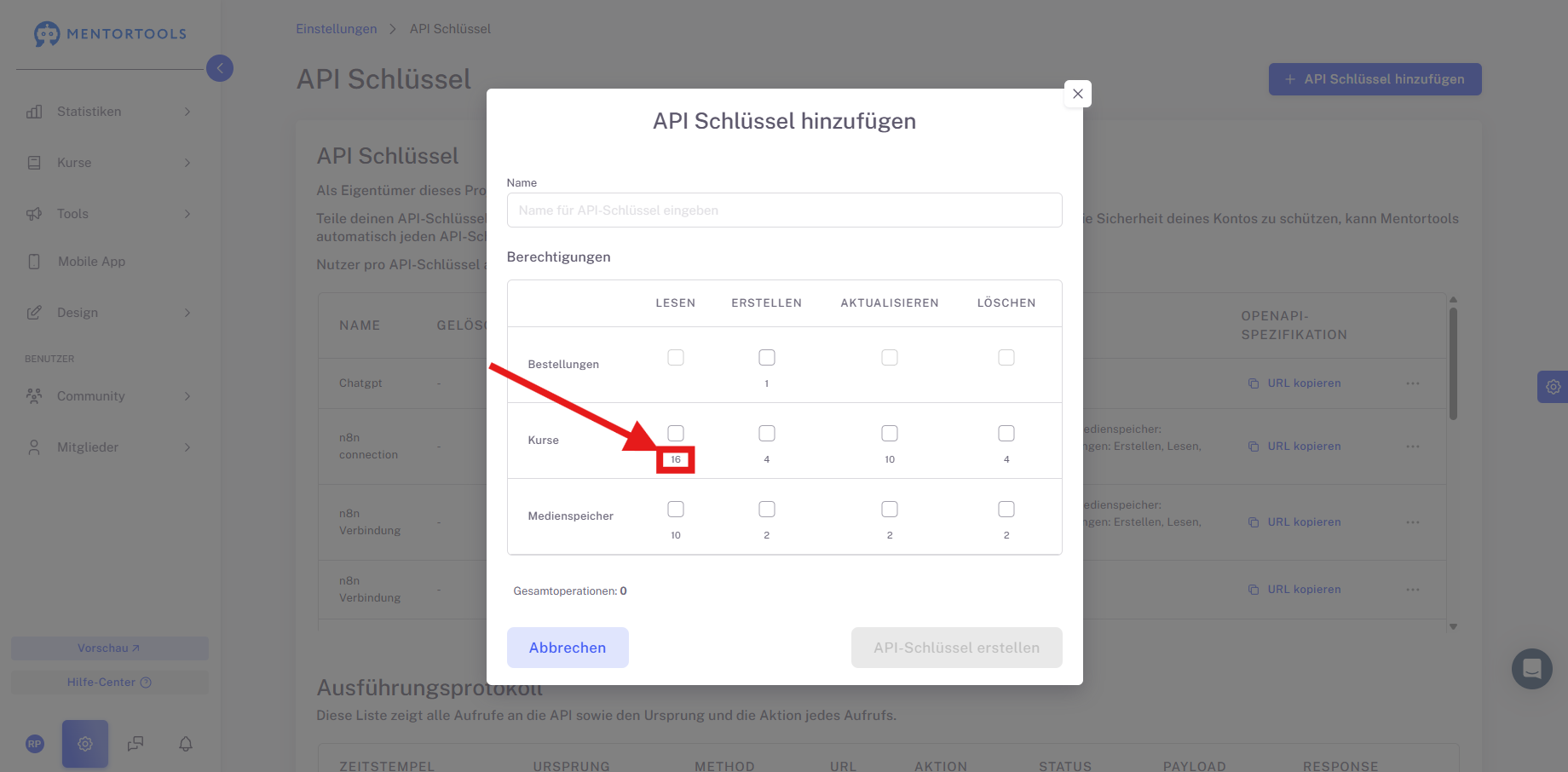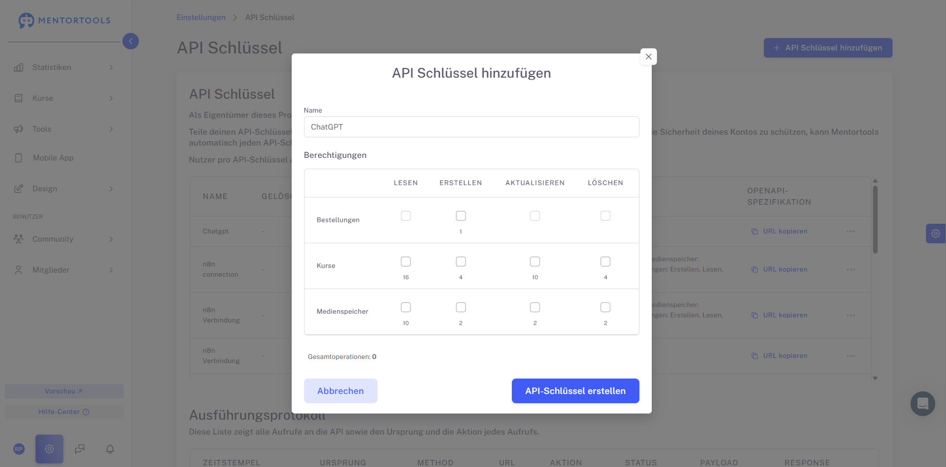 OpenAI unterstützt maximal 30 API Verknüpfungen. Eine Verknüpfung ist z.B. “Kurs erstellen”; eine andere ist “Modul erstellen”. In diesem Fall ist es notwendig in den Einstellungen im API Schlüssel in Mentortools gewisse Aktionen deaktivieren, die du nicht benötigst damit du unter 30 Gesamtoperationen bleibst.