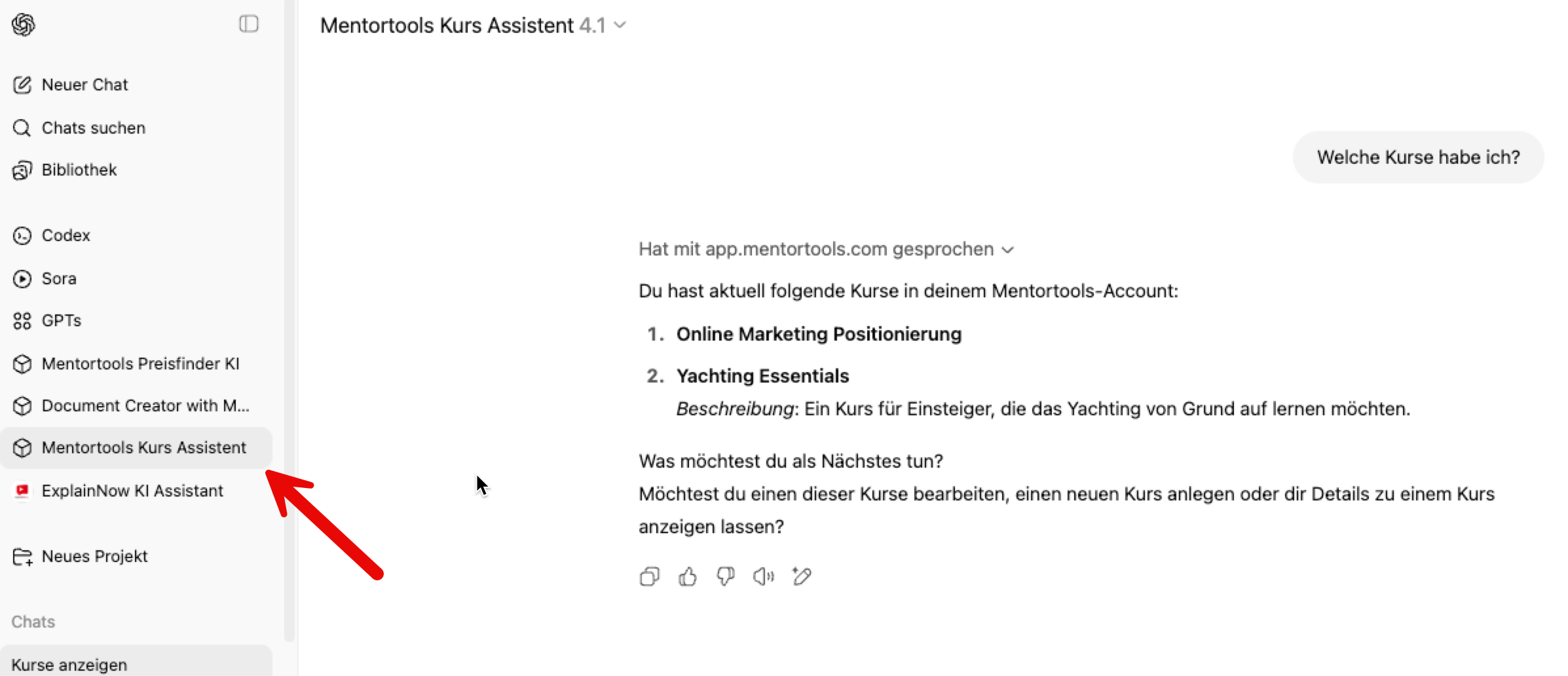 Beschreibung: Dieser GPT stellt eine Verbindung mit Mentortools her und ermöglicht dem Benutzer, über die API Online-Kurse zu erstellen und zu bearbeiten.